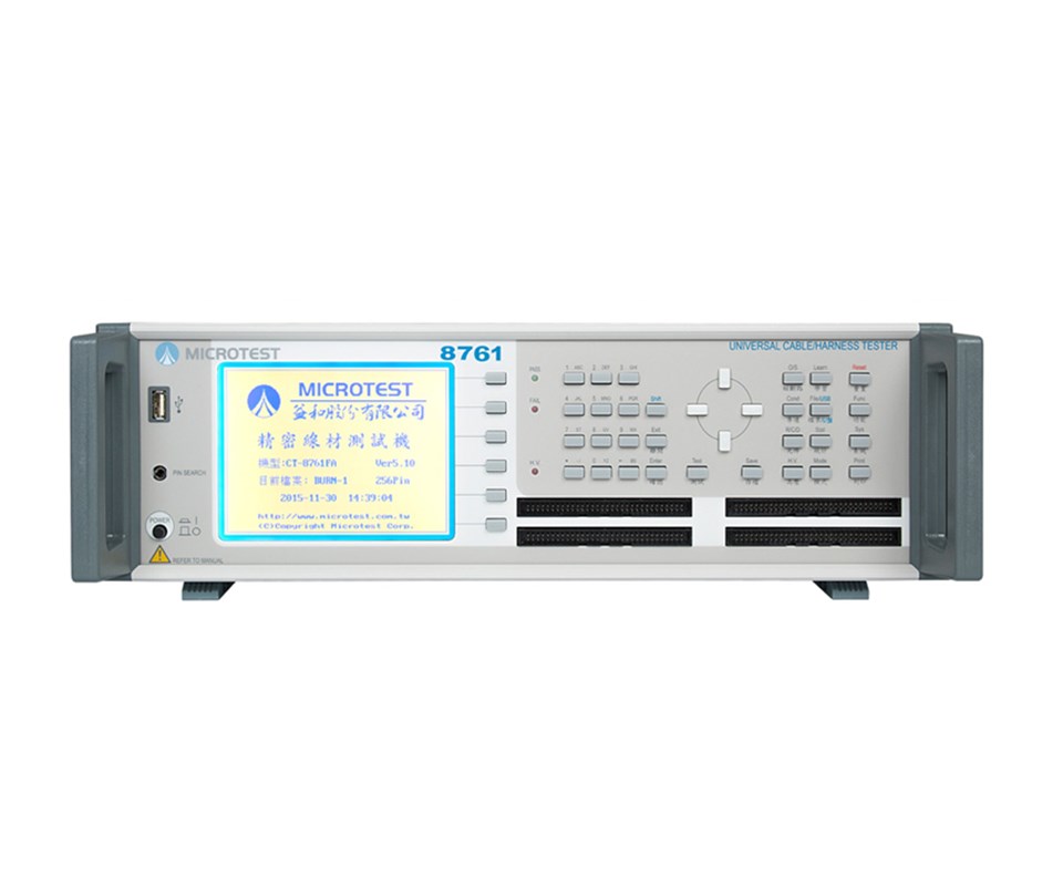 測試線材的項目包含: 導(dǎo)通阻抗、瞬間導(dǎo)通、元件測試 ( 電阻、電容、二極體 )、安規(guī)測試 (AC 高壓 / 漏電流、DC 高壓 / 漏電流 、絕緣阻抗 )、和短斷路、瞬間斷短路、快速瞬間斷路、短斷路端點(diǎn)判斷及單邊測試。支援RS-232, USB Host, Print, Remote等介面。
